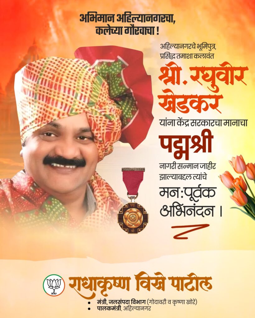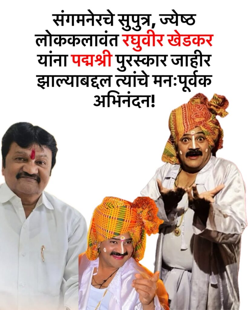 महाराष्ट्राच्या लोकसंस्कृतीची ओळख असलेल्या तमाशा लोककलेचा वारसा जपणाऱ्या आणि या कलेला राष्ट्रीय स्तरावर प्रतिष्ठा मिळवून देणाऱ्या संगमनेरच्या सुपुत्र रघुवीर खेडकर यांना केंद्र सरकारतर्फे पद्मश्री पुरस्कार जाहीर करण्यात आला आहे. या गौरवामुळे संगमनेर तालुक्यासह संपूर्ण महाराष्ट्रात आनंदाचे वातावरण आहे.